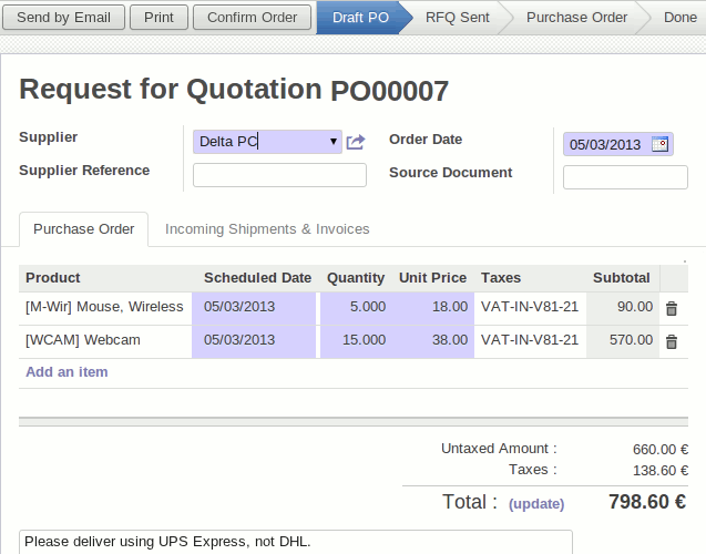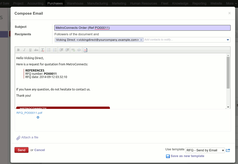 Create purchase tenders, gather and organise quotes from suppliers and compare proposals. Choose the best offer and send purchase orders easily. Use reporting to analyze the quality of your suppliers afterwards.