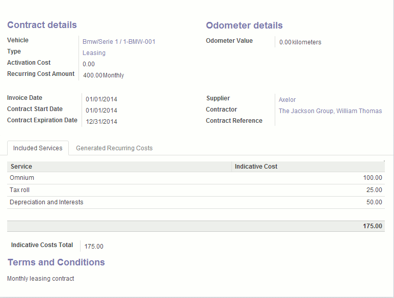 You can identify and trace the money spent by your company for each of the fleet vehicles. The recurring costs of your contracts (for example, leasing contracts) are automatically created at the beginning of each period (day/week/month/year) depending on the frequency specified in the contracts.